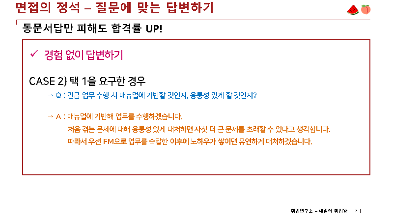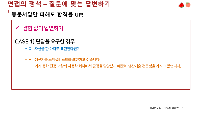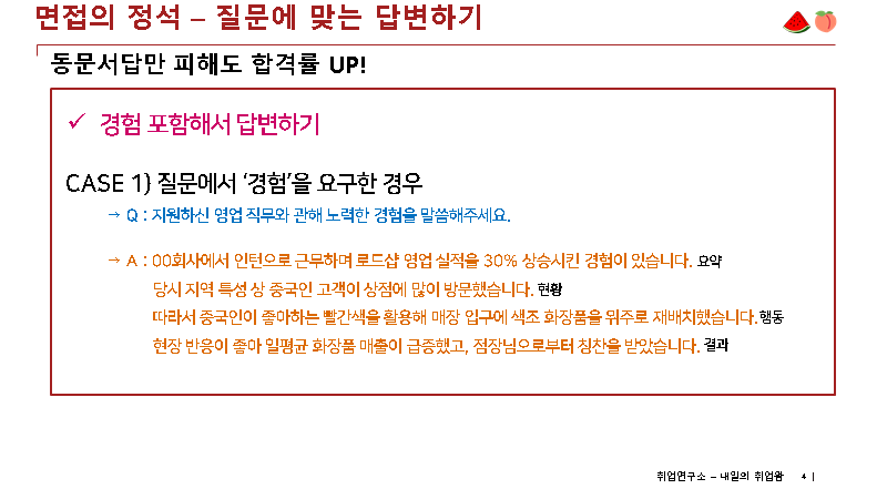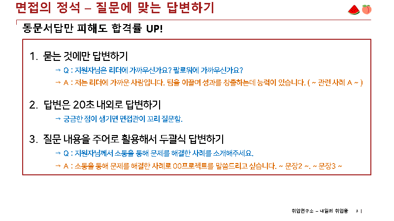 3) 면접관 질문에 대한 답변은 꼭 두괄식으로 하셔야, 논점 일탈을 방지할 수 있습니다.